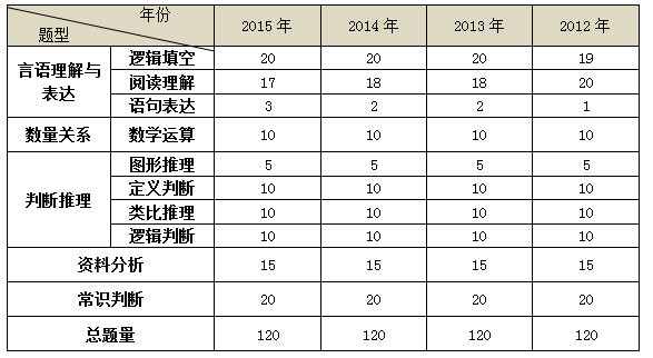 表:2012——2015年行測(cè)考試題型題量統(tǒng)計(jì)