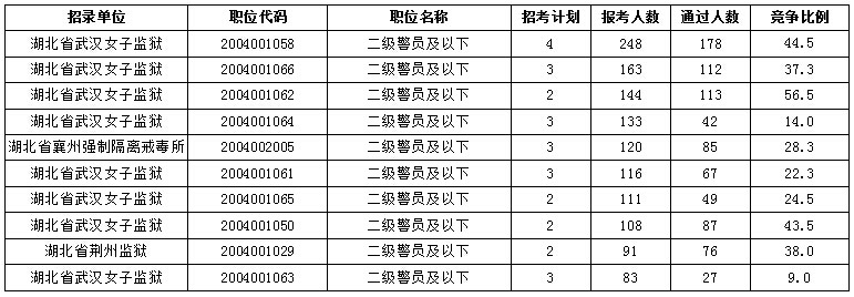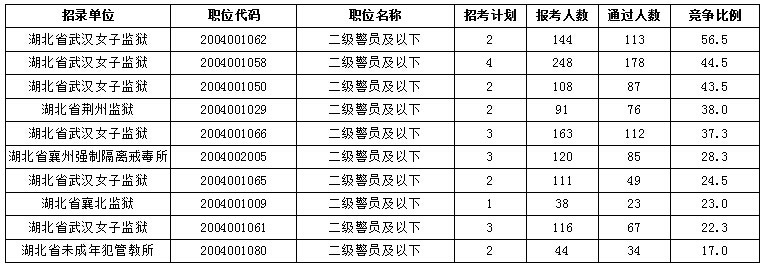 截止25日18時,2016年湖北公務員考試省監獄、戒毒系統140個職位共招錄357人,報考人數達到4085人,通過審核人數2574人,平均競爭比為7.2:1,所有職位均有人報考,5個職位無人通過審核。