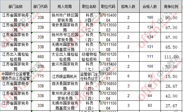報名通過審核人數前十的職位主要集中在江蘇省國家稅務局、江蘇出入境檢驗檢疫局,具體信息如下: