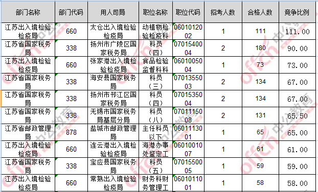 截止到17日16時,競爭比例的職位為江蘇出入境檢驗檢疫局太倉出入境檢驗檢疫局動植物檢驗檢疫科進境木材檢驗鑒定工作科員一職,招錄1人,截止到17日16時通過人數為111人。