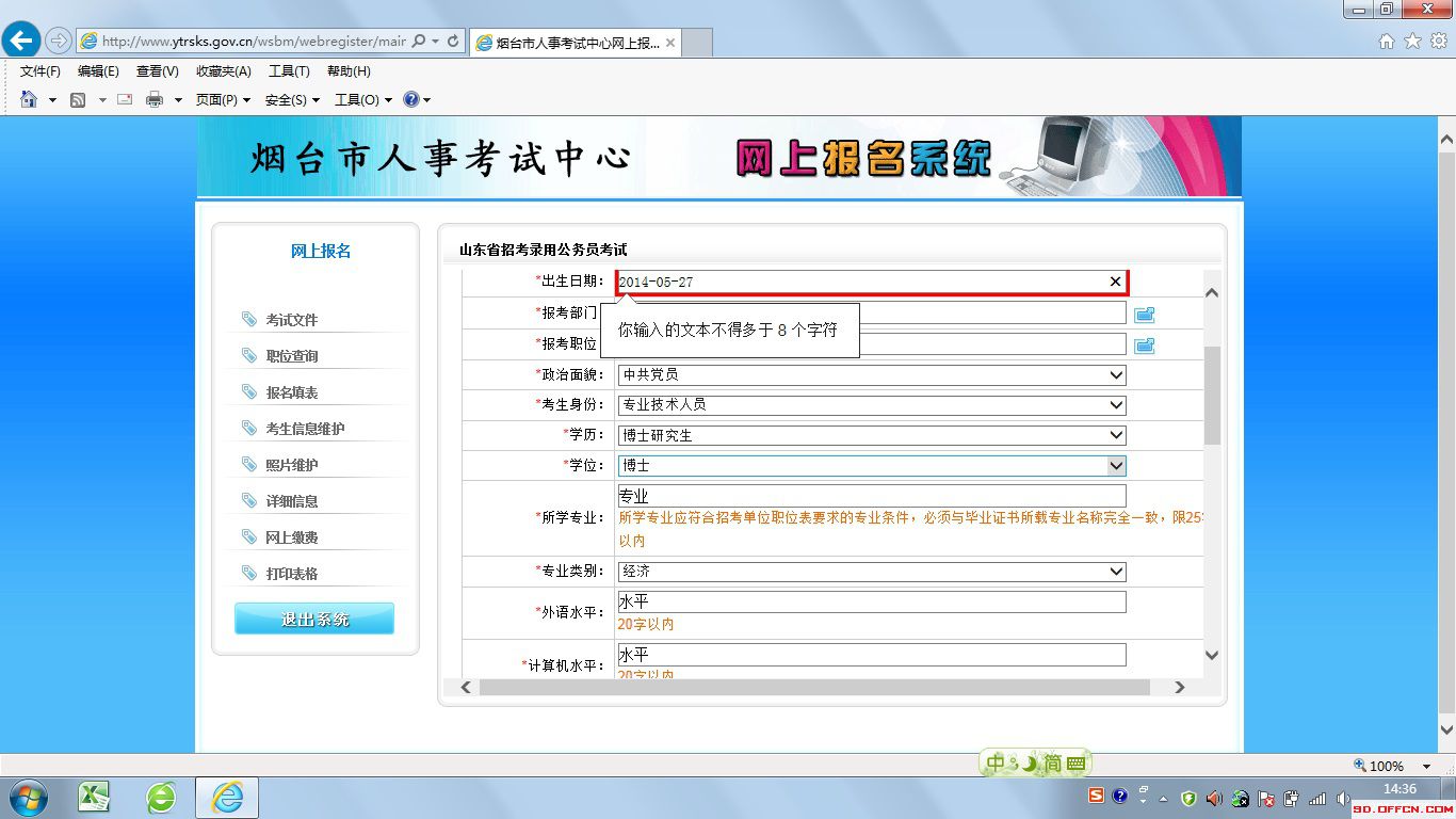 網(wǎng)上報名過程中,部分瀏覽器會出現(xiàn)“你輸入的文本不得多于8個字符”的錯誤: