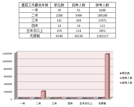 中公網(wǎng)校專家對2014國家公務(wù)員考試報名人數(shù)進(jìn)行了深入分析,將基層工作經(jīng)驗(yàn)各種不同要求的報名人數(shù)統(tǒng)計(jì)出,供考生參考。