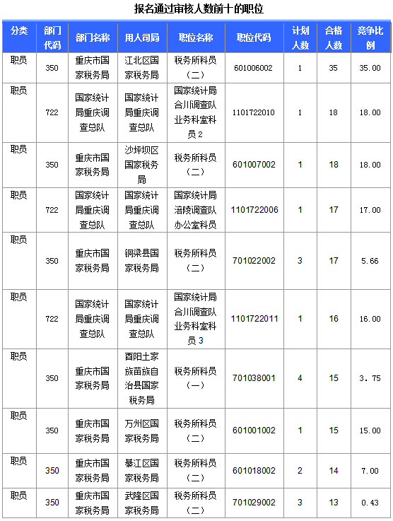 報名通過審核人數前十的職位主要集中在重慶市國家稅務局、國家統計局重慶調查總隊、中國銀行業監督管理委員會重慶監管局,具體信息如下: