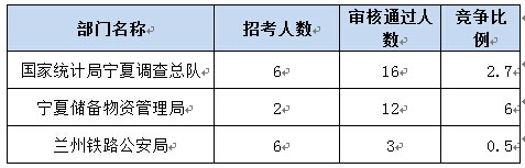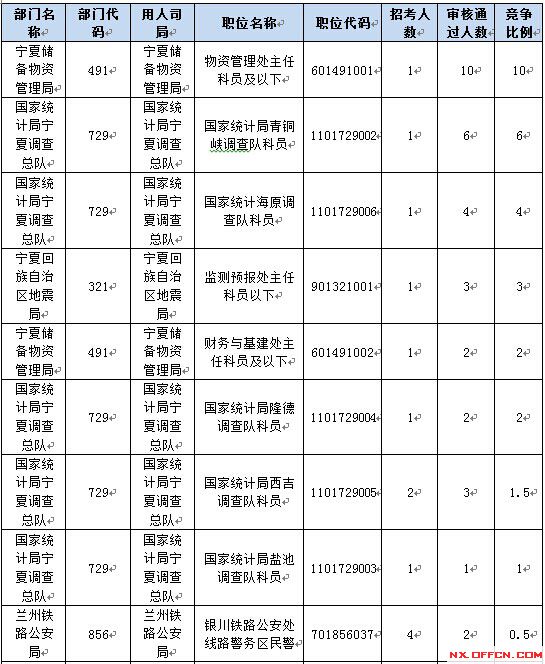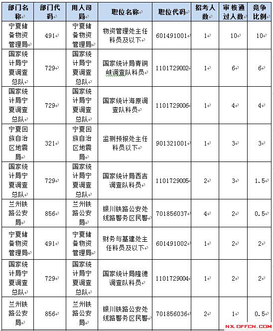 報名通過審核人數前十的職位主要集中在寧夏儲備物資管理局、國家統計局寧夏調查隊、蘭州鐵路公安局、寧夏回族自治區地震局等部門,具體信息如下: