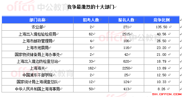 10月17日16時,2015國家公務員考試報名進入第3天。據中公網校統計,國考職位中工作崗位在上海的職位通過審核的總人數為7474人,共有42個職位無人通過審核,平均競爭比例為11.64:1。考生需注意這并不是最終的報名人數,審核時間是截至2014年10月26日18:00。
