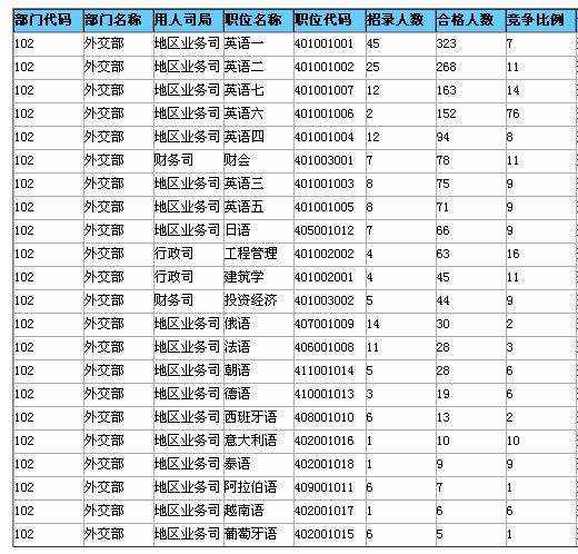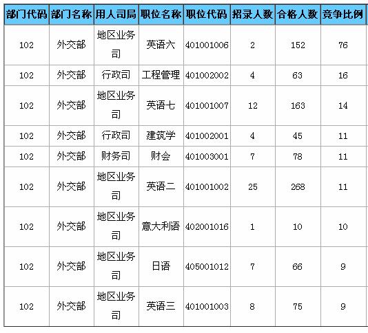 外交部競爭最激烈的職位是地區(qū)業(yè)務(wù)司的英語六一職,僅招錄2人。截至17日16時,已有152人通過了審核,競爭比高達(dá)76:1。該職位的工作主要是研究國際陸地、海洋邊界方面的外交實(shí)踐;處理有關(guān)邊界涉外事務(wù)及領(lǐng)土、地圖、地名等涉外案件;參加與鄰國陸地邊界劃界、勘界、聯(lián)合檢查及日常管理工作;參與海洋劃界、共同開發(fā)等相關(guān)外交談判工作。