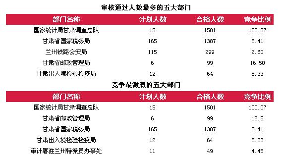 截至17日16時,通過審核人數(shù)前三位的部門依次是:國家統(tǒng)計局甘肅調(diào)查總隊、甘肅省國家稅務(wù)局、蘭州鐵路公安局,三部門通過審核總?cè)藬?shù)達(dá)3187人,占通過審核總?cè)藬?shù)的92%。 為幫助廣大考生更清晰的了解今日報名情況,中公網(wǎng)校整理了審核通過人數(shù)前五位的部門以及競爭比例最激烈的五大部門,供廣大考生參考: