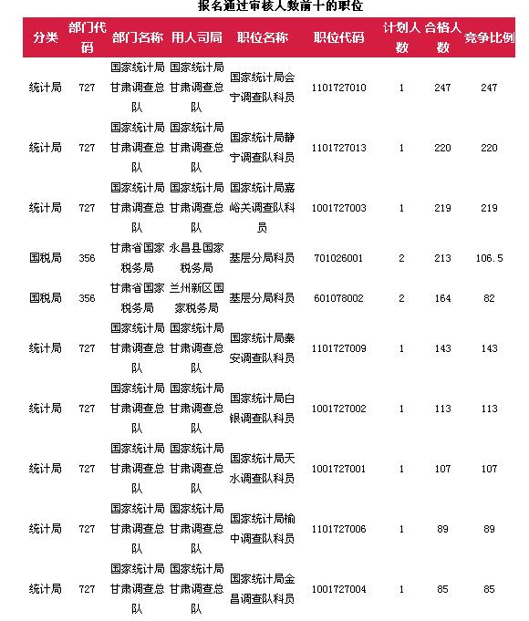 截至17日16時,招錄比例的職位為國家統(tǒng)計局甘肅調(diào)查總隊國家統(tǒng)計局會寧調(diào)查隊科員,招錄1人,通過人數(shù)為247人,競爭比例為247:1