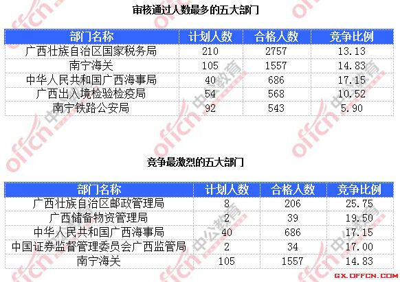 為幫助廣大考生更清晰的了解今日報名情況,中公網校整理了審核通過人數前五位的部門以及競爭比例最激烈的五大部門,供廣大考生參考: