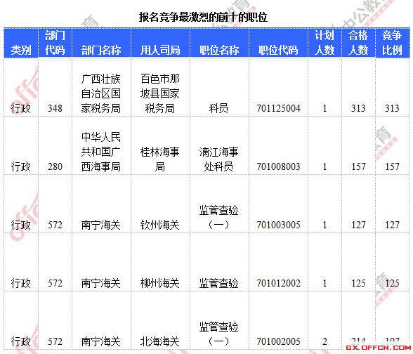 截至20日8時,招錄比例的職位依然是百色市那坡縣國家稅務局科員一職,招錄1人,審核通過人數為313人,競爭比例313:1,競爭比例超100的職位有五個。