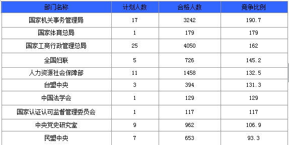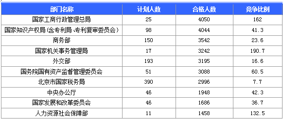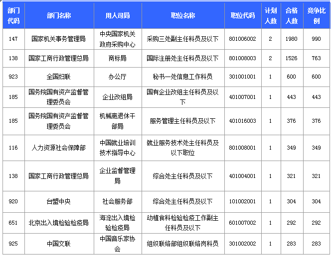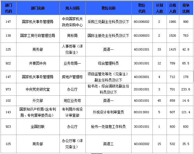 報(bào)名通過審核人數(shù)前十的職位主要集中在國(guó)家機(jī)關(guān)事務(wù)管理局、國(guó)家工商行政管理總局、商務(wù)部、共青團(tuán)中央等部門,具體信息如下: