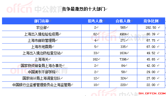 10月20日16時(shí),2015國家公務(wù)員考試報(bào)名進(jìn)入第6天。據(jù)中公教育統(tǒng)計(jì),國考職位中工作崗位在上海的職位通過審核的總?cè)藬?shù)為19453人,共有13個(gè)職位無人通過審核,平均競爭比例為30.3:1。考生需注意這并不是最終的報(bào)名人數(shù),審核時(shí)間是截至2014年10月26日18:00。