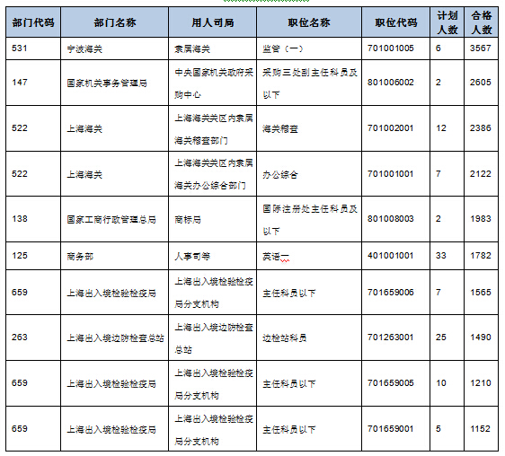 另外截至今日8時(shí),2015國考職位中已有四個(gè)職位審核人數(shù)超過了兩千人,分別是寧波海關(guān)隸屬海關(guān)的監(jiān)管一、國家機(jī)關(guān)事務(wù)管理局的中央國家機(jī)關(guān)政府采購中心采購三處副主任科員及以下、上海海關(guān)關(guān)區(qū)內(nèi)隸屬海關(guān)稽查部門的海關(guān)稽查及上海海關(guān)關(guān)區(qū)內(nèi)隸屬海關(guān)辦公綜合部門的辦公綜合等四個(gè)。破兩千的職位中,有三個(gè)職位為海關(guān)相關(guān),可見海關(guān)職位作為國考中的傳統(tǒng)熱門魅力仍不減。