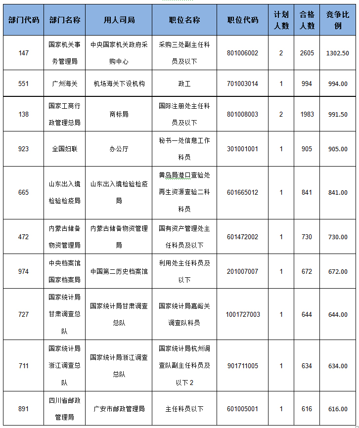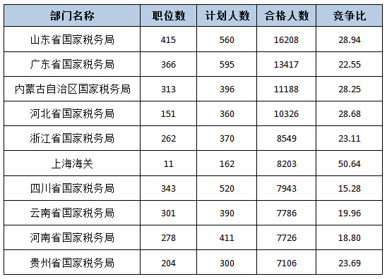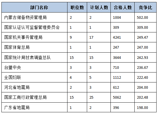 在參與招錄的490個(gè)部門中,山東省國家稅務(wù)局審核通過的人數(shù)仍位居榜首,已過審16208人;內(nèi)蒙古儲(chǔ)備物資管理局職位的競爭最為激烈,招錄2人,過審1004人,平均競爭比達(dá)502:1。