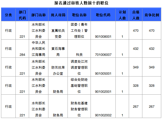 報名通過審核人數前十的職位主要集中在水利部長江水利委員會、中華人民共和國長江海事局黃石海事局等部門,具體信息如下: