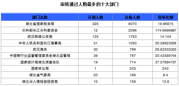 截至21日16時,通過審核人數前三位的部門依次是:湖北省國家稅務局、水利部長江水利委員會、武漢鐵路公安局,三部門通過審核總人數達9929人,占通過審核總人數的69.5%。