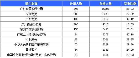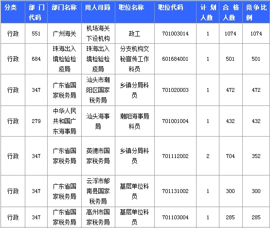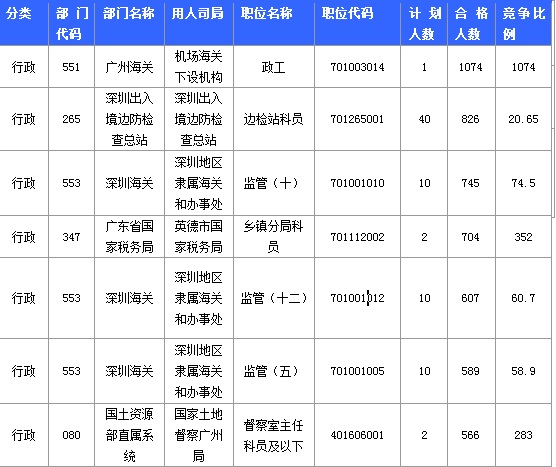 截至21日16時,招錄比例的職位為廣州海關政工一職,招錄1人,通過人數為1074人,報名通過審核人數前十的職位主要集中在廣州海關、深圳出入境邊防檢查總站、深圳海關等部門,具體信息如下:
