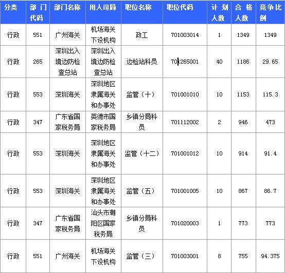 截至23日8時,招錄比例的職位為廣州海關政工一職,招錄1人,通過人數為1349人,報名通過審核人數前十的職位主要集中在廣州海關、深圳出入境邊防檢查總站、深圳海關,具體信息如下: