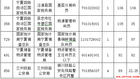 截至23日8時,工作地在寧夏地區(qū)的共有2個職位無人報考,占全部職位的 2.6%。下面是無人報考職位一覽表,中公網(wǎng)校專家建議廣大考生多關(guān)注一些競爭激烈性小的職位,避免激烈競爭,結(jié)合自身條件,找到屬于自己的職位。