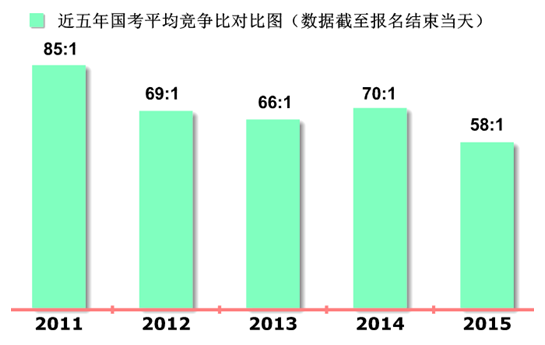 2015年度“國(guó)考”報(bào)名工作于10月24日晚如期結(jié)束。截止24日17:30,審核通過(guò)總?cè)藬?shù)129萬(wàn)人,競(jìng)爭(zhēng)比為58:1。去年同期數(shù)據(jù)為136萬(wàn)人,競(jìng)爭(zhēng)比為70:1。目前各招錄機(jī)關(guān)審核仍在進(jìn)行中,周末將統(tǒng)計(jì)出最終的報(bào)名數(shù)字。中公網(wǎng)校專(zhuān)家緊跟國(guó)考報(bào)名全過(guò)程,發(fā)現(xiàn)今年報(bào)考呈現(xiàn)三大特點(diǎn):