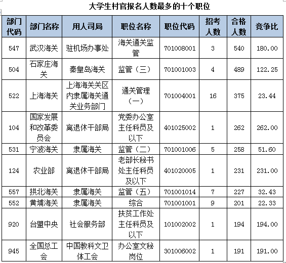 截至24日17:30,大學(xué)生村官報(bào)名人數(shù)最多的十個(gè)職位中有6個(gè)是縣(區(qū))級(jí)及以下機(jī)構(gòu)層級(jí),“武漢海關(guān)”的“海關(guān)監(jiān)管”一職位居榜首,競(jìng)爭(zhēng)比排第五。而競(jìng)爭(zhēng)最激烈的是“國(guó)家發(fā)展和改革委員會(huì)”的“黨委辦公室主任科員及以下”一職,競(jìng)爭(zhēng)比高達(dá)262:1。