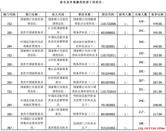 10月24日,2015國家公務員考試報名結束。根據國家公務員考試網統計的數據顯示,截至10月24日18時,國考報名重慶地區審核通過人數已達20154人。其中競爭最激烈的職位為國家統計局涪陵調查隊辦公室科員,招錄1名,現已有479人報名。國考報名的資格審核流程還在繼續,最終報名通過審核的人數將在10月26日18時后公布。