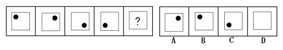 (答案:B。黑點(diǎn)在正方形中順時(shí)針移動(dòng)。在第5個(gè)圖形中,應(yīng)該正好移動(dòng)到左上角。)