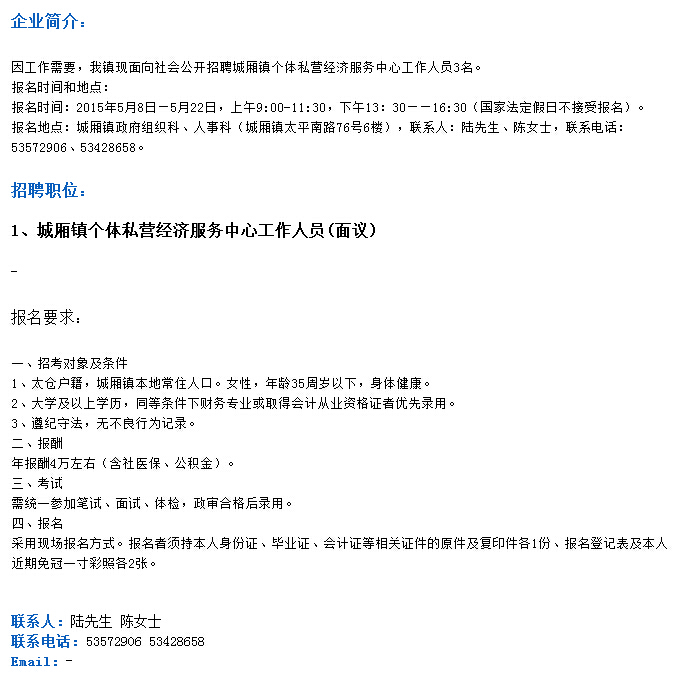 2015年江蘇省太倉市城廂鎮(zhèn)人民政府個體私營經(jīng)濟服務(wù)中心招聘公告【招3人】