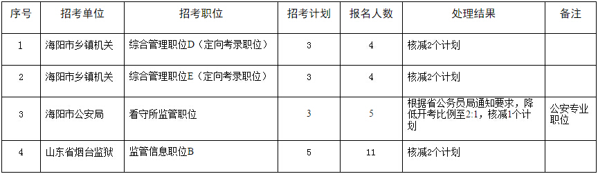 根據《2015年煙臺市各級機關及直屬單位考試錄用公務員公告》、《2015年煙臺市考試錄用公安機關人民警察公告》、《2015年煙臺監獄考試錄用公務員 (人民警察)公告》等有關規定,煙臺市公務員考錄4個職位因繳費人數未達到規定開考比例,其錄用計劃予以核減,現予公告: