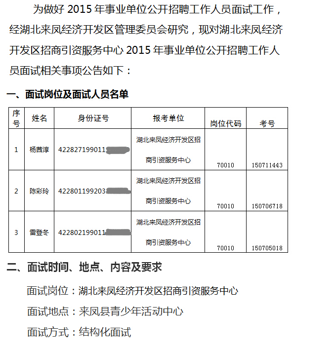 2015湖北來鳳經(jīng)濟開發(fā)區(qū)招商引資服務(wù)中心事業(yè)單位招聘員面試公告
