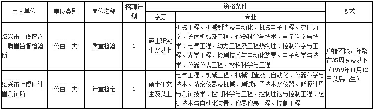 紹興市上虞區質量技術監督局下屬事業單位紹興市上虞區產品質量監督檢驗所、紹興市上虞區計量測試所,因工作需要,根據《上虞市事業單位招聘高層次和緊缺型人才暫行辦法》(市委辦[2008]115號)的文件精神,經有關部門同意,公開招聘高層次人才2名。現將有關事項公告如下: