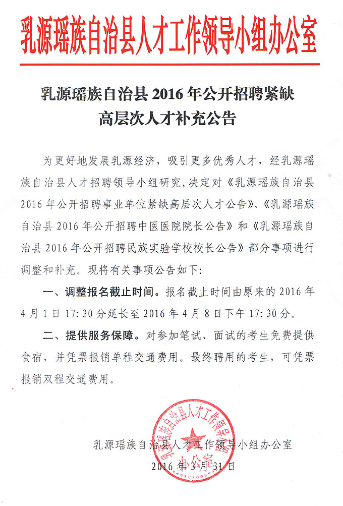 2016廣東乳源瑤族自治縣招聘緊缺高層次人才補充公告