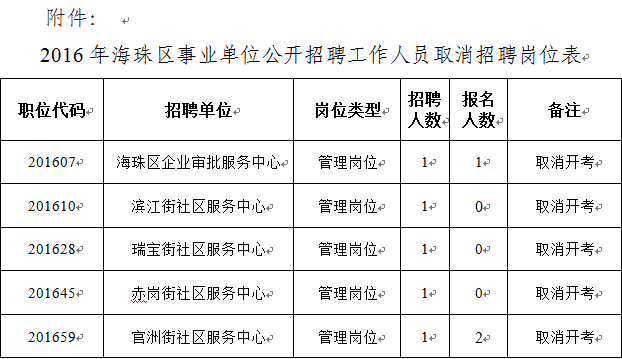 原標(biāo)題:關(guān)于取消2016年海珠區(qū)公開招聘事業(yè)單位工作人員部分招聘崗位開考的通知