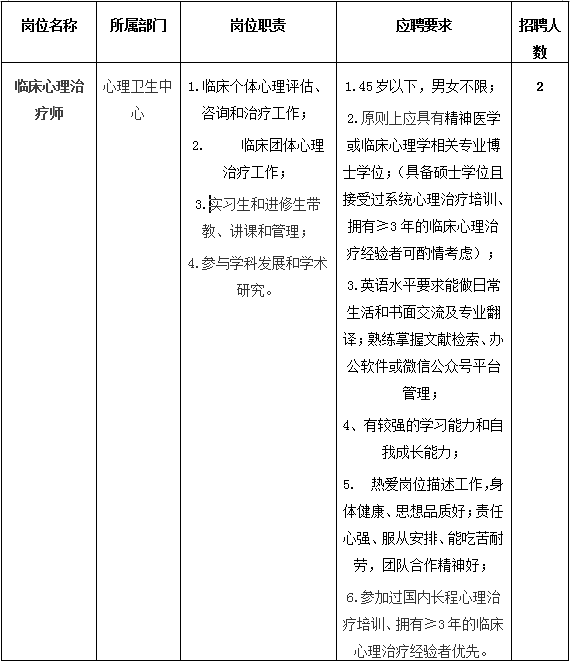 我院心理衛生中心現在面向社會公開招聘臨床心理治療師兩名: