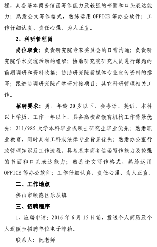 2016廣東順德現代職業教育研究院招聘公告【2人】