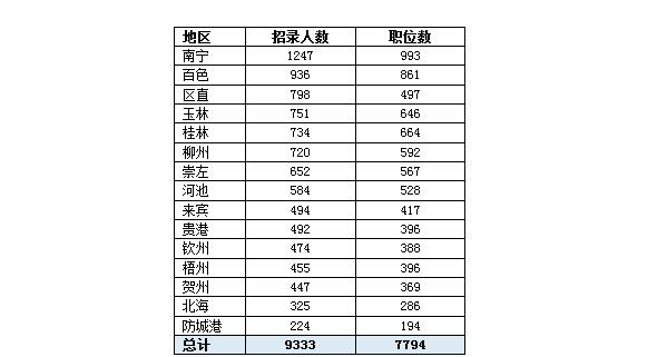 本次考試招錄計劃覆蓋廣西各個地(市),其中首府南寧一1247人、993個職位在招錄榜單上居于首位,百色地區以936人、861個職位緊隨其后,區直機關招錄規模也不可小覷,招錄798人、497個職位,對于向往直接進行區直機關工作的考生來說是一利好消息。